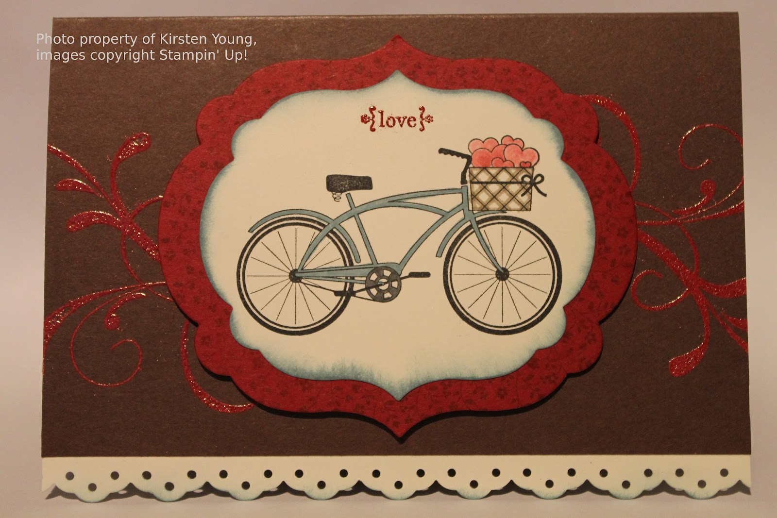 I used Pedal Presents, Tiny Tags and Everything Eleanor stamp sets, Chocolate Chip, Very Vanilla and Cherry Cobbler cardstock, Basic Black, Cherry Cobbler, Baja Breeze, Basic Gray and Crumb Cake ink, VersaMark and Cherry Cobbler embossing powder, Eyelet Border punch, Big Shot and new Framelits dies.